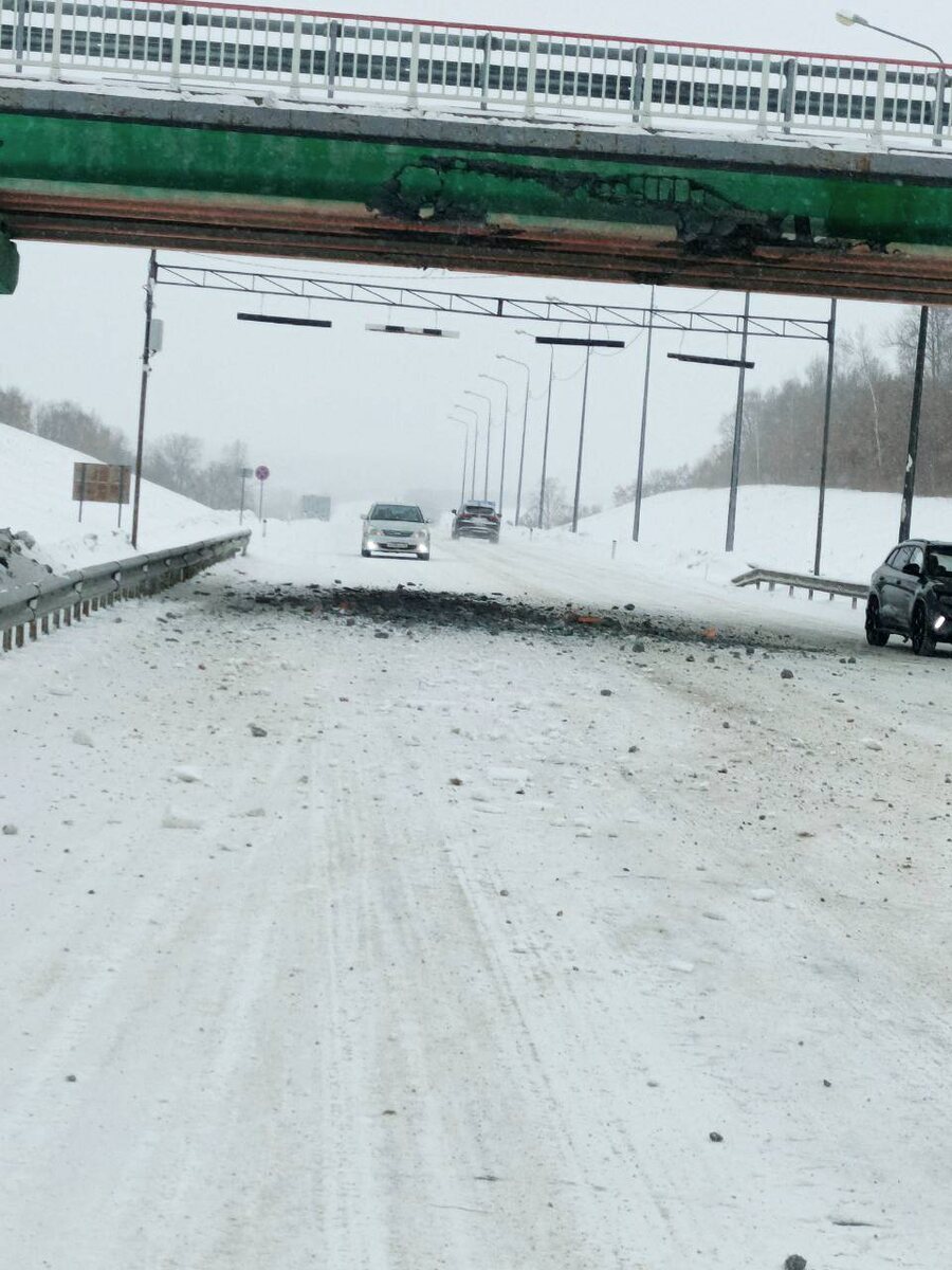 Серьезное дорожное происшествие зафиксировано на федеральной автомобильной дороге в районе транспортной развязки у населенного пункта Серышево. По сообщениям очевидцев, крупногабаритный транспорт — длинномер, перевозивший экскаватор, — совершил столкновение с конструкциями путепровода (виадука). В результате происшествия произошло частичное разрушение элементов мостового сооружения. На опубликованных кадрах видно, что на проезжую часть обрушились фрагменты бетона и облицовки, которые в данный момент создают дополнительные препятствия для проезжающих автомобилей. Судя по характеру повреждений, водитель спецтехники не учел габариты перевозимого груза по высоте при проезде под пролетом виадука. Ситуация усугубляется сложными метеоусловиями: дорожное полотно покрыто снегом, что снижает видимость и увеличивает тормозной путь. Наличие крупных обломков бетона на полосе движения в таких условиях представляет прямую угрозу для безопасности автомобилистов и может привести к повреждению колес и