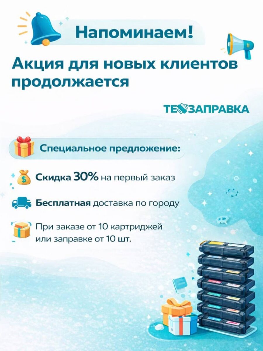 Если Вы ещё не сотрудничали с нами — сейчас самое время начать 🤝 🎁 Специальное предложение: 💸 Скидка 30% на первый заказ 🚚 Бесплатная доставка по городу 📦 При заказе от 10 картриджей или при заправке от 10 шт. Это отличная возможность сократить расходы на печать без потери качества. Работаем оперативно, по договору, с закрывающими документами для бухгалтерии 📑 📲 Напишите нам или позвоните — рассчитаем стоимость и зафиксируем скидку. Количество акционных заказов ограничено. Успейте воспользоваться выгодой! Контакты для сотрудничества: 🌐 Сайт: https://tehzapravka.ru/ 📞 Телефон: +7 (4722) 411-411 ✉️ E-mail: tehzapravka@yandex.ru