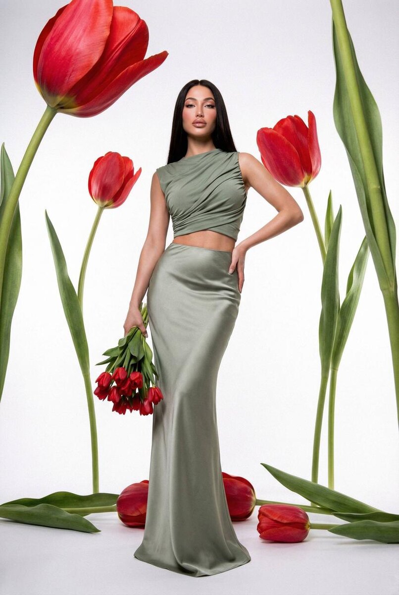 Сгенерировать фото🪄 Композиция в полный рост для модной фотосессии, на которой женщина стоит среди огромных сюрреалистических красных тюльпанов с удлиненными зелеными стеблями, вертикально обрамляющими сцену. Модель стоит в элегантной позе контрапоста, одна рука лежит на бедре, а другая держит букет свежих тюльпанов у торса. Длинные, гладкие и прямые волосы, естественно ниспадающие на плечи, с центральным пробором, создающим чистые минималистичные линии. На ней асимметричный укороченный топ цвета шалфея, обнажающий талию, в сочетании с атласной юбкой до пола с высокой талией в том же оттенке, создающей плавное движение силуэта. Съемка производилась немного ниже уровня глаз для визуального удлинения, чистый белый студийный фон подчеркивает минимализм модной кампании, мягкое направленное освещение создает нежные тени и атмосферу высокой моды, мягкое скульптурное лицо, румяные щеки, блестящие губы, четко очерченные брови. Нейтральное теплое освещение с легкой вспышкой фронтальной камеры