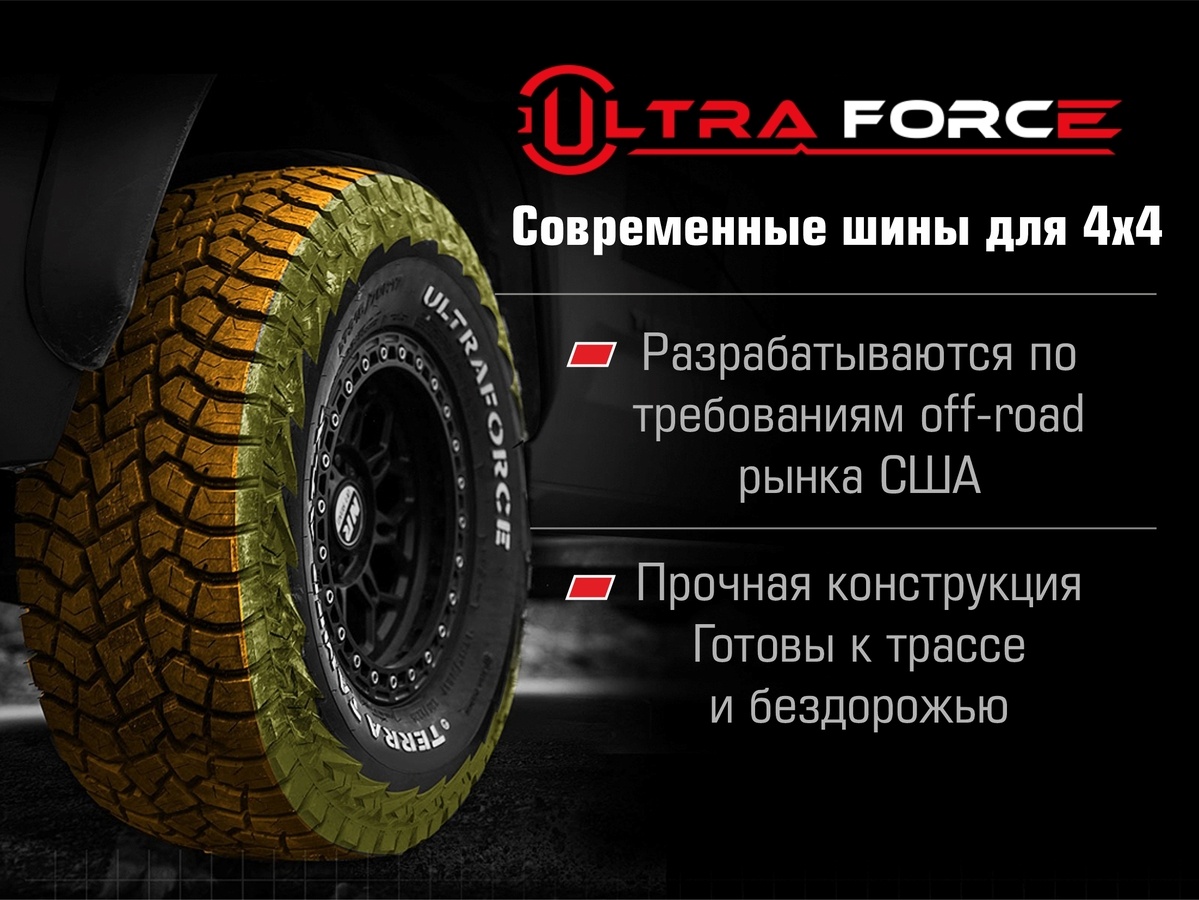 — стабильное пятно контакта для спокойной и предсказуемой езды по трассе — развитая плечевая зона с рабочими гранями — больше контроля на грунте и в колее — усиленная боковина — дополнительная стойкость к повреждениям — камневыталкиватели — защита протектора от набивания щебнем — маркировка 3PMSF — пригодность для снежных условий и межсезонья Итог: AT-X — универсальная A/T для тех, кому нужен один комплект: комфорт на дороге и уверенная работа на грунте. ULTRAFORCE Terra Tamer разрабатываются с учётом требований американского off-road рынка: современный рисунок протектора и смесь, прочная конструкция, уверенный зацеп и самоочистка в грязи и на снегу. Плюс маркировка 3PMSF («три горных пика») — подтверждённая пригодность для снежных услови