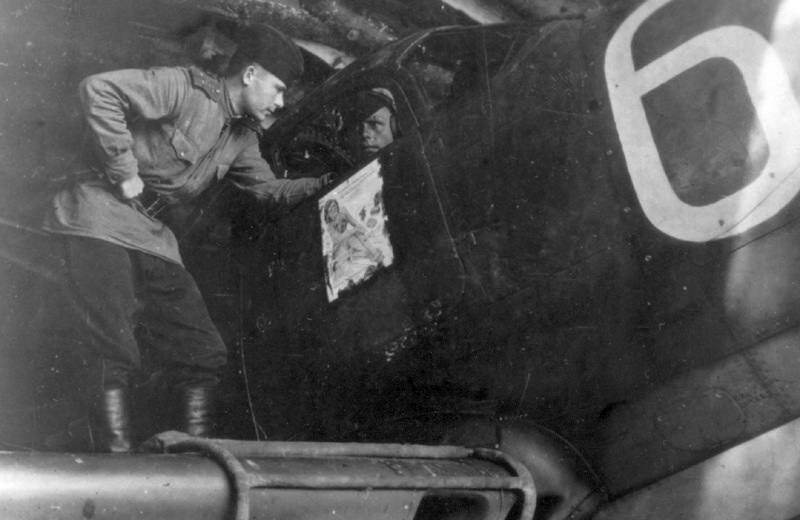«Аэрокобра» 102 ГИАП (Гвардейского истребительного авиационного полка) с наклеенной на дверку журнальной страницей с фотографией женщины в купальнике.