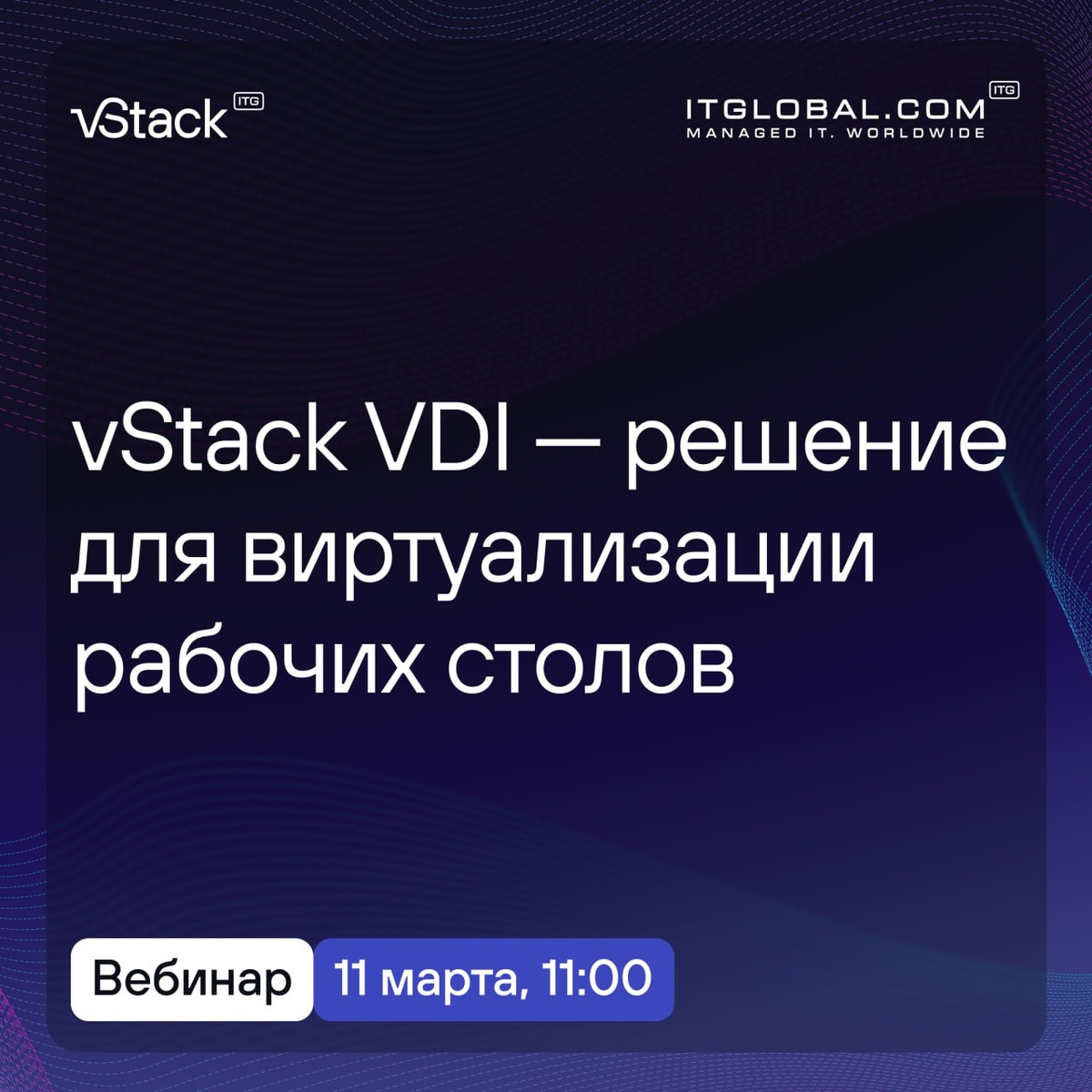 »! Удалённая работа и гибридные модели стали новой реальностью. Но как обеспечить сотрудникам безопасный доступ к корпоративным ресурсам без ущерба для производительности и защищенности? vStack VDI — это российское решение для виртуализации рабочих столов, которое сочетает простоту управления, высокую производительность и надёжность. Когда: 11 марта в 11:00 (МСК) Спикеры: генеральный директор vStack Евгений Карпов и заместитель директора по развитию системной интеграции ITGLOBAL.COM Сергей Алаев. Что вы узнаете на вебинаре: 🔘 Как vStack VDI решает задачи удалённого доступа и централизованного управления рабочими местами 🔘 Преимущества решения: от экономии ресурсов до повышения безопасности 🔘 Живая демонстрация возможностей платформы 🔘 Ответы экспертов на ваши вопросы Присоединяйтесь и узнайте, как сделать ИТ-инфраструктуру вашей компании проще, безопаснее и эффективнее с vStack VDI! До встречи на вебинаре! 🔗 Участие бесплатное по предварительной регистрации