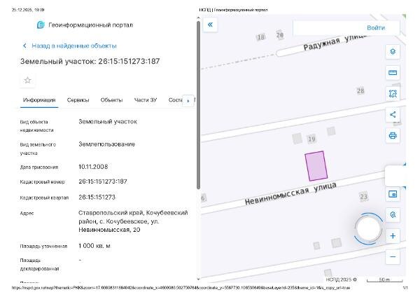 использования: для ведения личного подсобного хозяйства, площадь 1000 +/- 22,14 кв.м, кадастровый номер 26:15:151273:187, ограничение прав и обременение объекта: ипотека в силу закона, запрещения регистрации, адрес: Ставропольский край, Кочубеевский район, с. Кочубеевское, ул. Невинномысская, 20. Канал: Госземля Ставропольский край Область: край Ставропольский Кочубеевский район Район: с. Кочубеевское Населенный пункт: ул. Невинномысская, 20. Локация: Смотреть на карте ВРИ: Иной вид Кадастровый номер: 26:15:151273:187 Кадастровая стоимость: - Вид сделки: Продажа Площадь: 1000 м² Начальная цена: 316880.00 руб. Дата завершения: 11.03.2026 Подробнее: ГИС ТОРГИ #госземля #земляотгосударства #земля #земельныйучасток #земельныеторги #торги #аукцион #продажаземли #продажа #ставропольскийкрай
