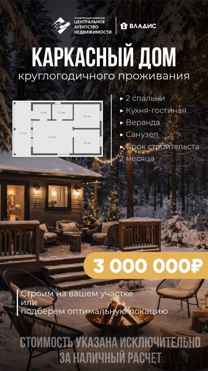 Предлагаем строительство каркасного дома для круглогодичного проживания на участке заказчика