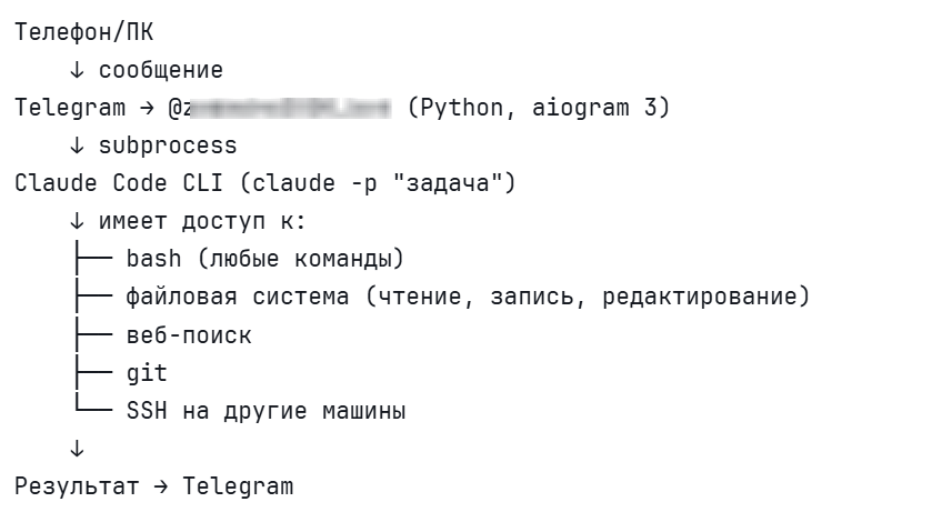 Пишешь задачу в Telegram с телефона — Claude Code выполняет на сервере — присылает результат.