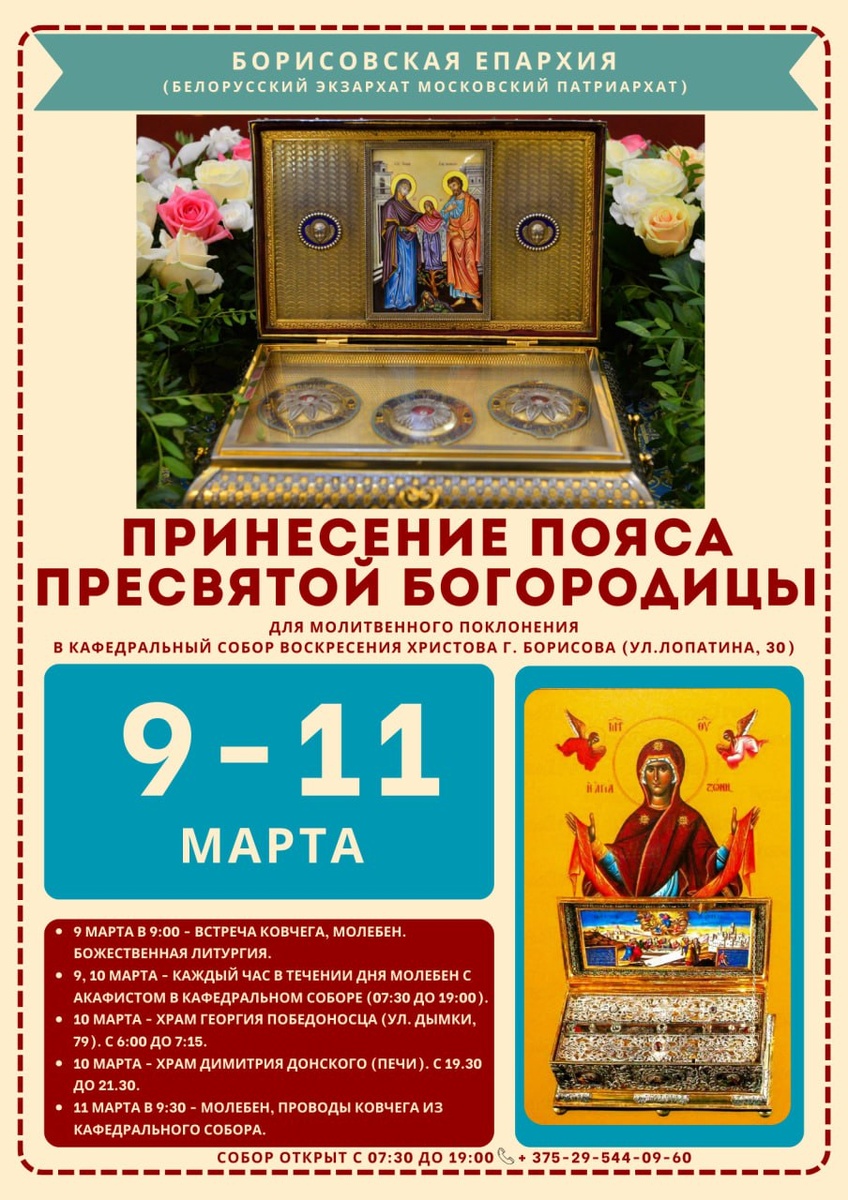 города Борисова примет великую святыню – ковчег с частью Пояса Пресвятой Богородицы и частицами святых мощей праведных Иоакима и Анны, родителей Пречистой Девы. 9 марта 2026 года в 9:00 состоится встреча святыни в кафедральном соборе. Молебен Божией Матери возглавит епископ Борисовский и Марьиногорский Амвросий. После богослужения ковчег со святыней будет открыт для поклонения: каждый верующий сможет испросить у Богородицы помощи и молитвенного покрова. В период пребывания святыни в соборе (до 9:30 11 марта) будут совершаться молебны Божией Матери. 🙏🏻Приглашаем всех разделить эту духовную радость и испросить молитвенной помощи у Царицы Небесной. ⛪️Наш адрес: г. Борисов, ул. Лопатина, д. 30. Кафедральный собор открыт ежедневно с 07:30 до 19:00.