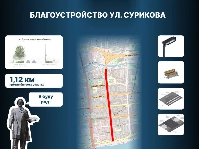 Мэр Красноярска Сергей Верещагин в целях безопасности и комфорта пешеходов призвал подрядчиков к поэтапности благоустройства улиц в исторической части города. Как сообщил Сергей Викторович в соцсети и мессенджерах, в этом году планируют благоустроить помимо улицы Диктатуры Пролетариата и Кирова ещё и улицу Сурикова. В прошлом году благоустройству подверглись 4 улицы: Дзержинского, Перенсона, 9 Января и Каратанова, сроки по которым были подрядчиком сорваны не один раз. "Прорабатываем решение сделать комфортнее в этом сезоне ещё одну улицу исторического центра – имени нашего великого земляка, художника Василия Сурикова. Специалисты разрабатывают техдокументацию, уточняют все вопросы по финансированию и видам работ. Но в целом задачи примерно те же, что и на Кирова с Диктатуры Пролетариата: обновить пешеходную часть, уличную мебель, освещение с переносом линий под землю. Отдельно – ремонт дороги. На что поручил обратить внимание по всем трём объектам, учитывая первый, достаточно непрост