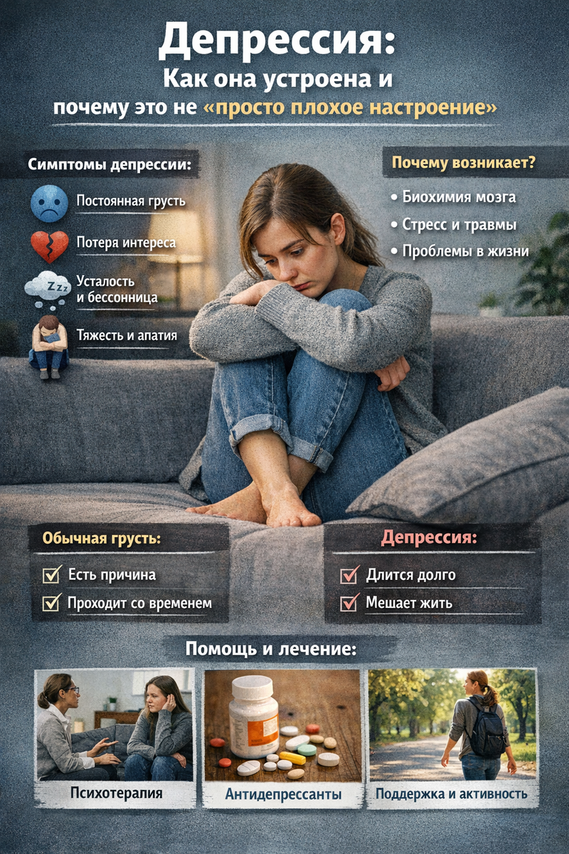 Депрессия: как она устроена и почему это не «просто плохое настроение» Депрессия — один из самых изученных разделов клинической психологии. При этом вокруг неё до сих пор много мифов. Кто-то считает её слабостью, кто-то — «надуманной проблемой». На самом деле депрессия — это реальное психическое расстройство, которое влияет не только на настроение, но и на мышление, тело и поведение человека. Самый известный диагноз в этой области — Большое депрессивное расстройство. Это состояние, при котором человек в течение как минимум двух недель почти каждый день испытывает подавленность или теряет интерес к жизни. Как проявляется депрессия? Многие думают, что депрессия — это просто сильная грусть. Но её проявления гораздо шире. Эмоциональные симптомы: Мыслительные симптомы: Поведенческие симптомы: Физические симптомы: Важно понимать: депрессия — это не только «в голове». Она затрагивает весь организм. Почему возникает депрессия? Причины обычно складываются из нескольких факторов. 1. Биологически