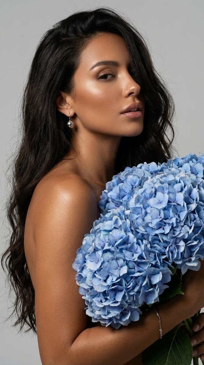 Промт для ИИ: профильный портрет женщины с длинными волнистыми волосами и букетом голубых гортензий в драматичном свете Модель: Nano Banana Сгенерировать🪄 Используй лицо женщины с загруженного фото. Ультрареалистичный портрет крупным планом в формате 9:16, ракурс 3/4. Черты лица строго сохранены в соответствии с референсом — без изменений и искажений. Женщина изображена в профиль. Освещение и кожа: Продуманное низкое угловое освещение с затемнением создает драматичный, скульптурный эффект, подчеркивая контур лица, рельеф кожи и объем волос. Кожа загорелая, мягко сияющая, с атласным финишем и естественным здоровым блеском — текстура проработана до мельчайших пор. Волосы и лицо: Супер длинные волнистые волосы с объемными, упругими локонами эффектно ниспадают, частично закрывая лицо и спадая на обнаженное плечо. Выражение лица спокойное, чувственное, губы слегка полуоткрыты, создавая атмосферу утонченной интимности. Аксессуары и образ: На женщине — минималистичные серебряные серьги-шар