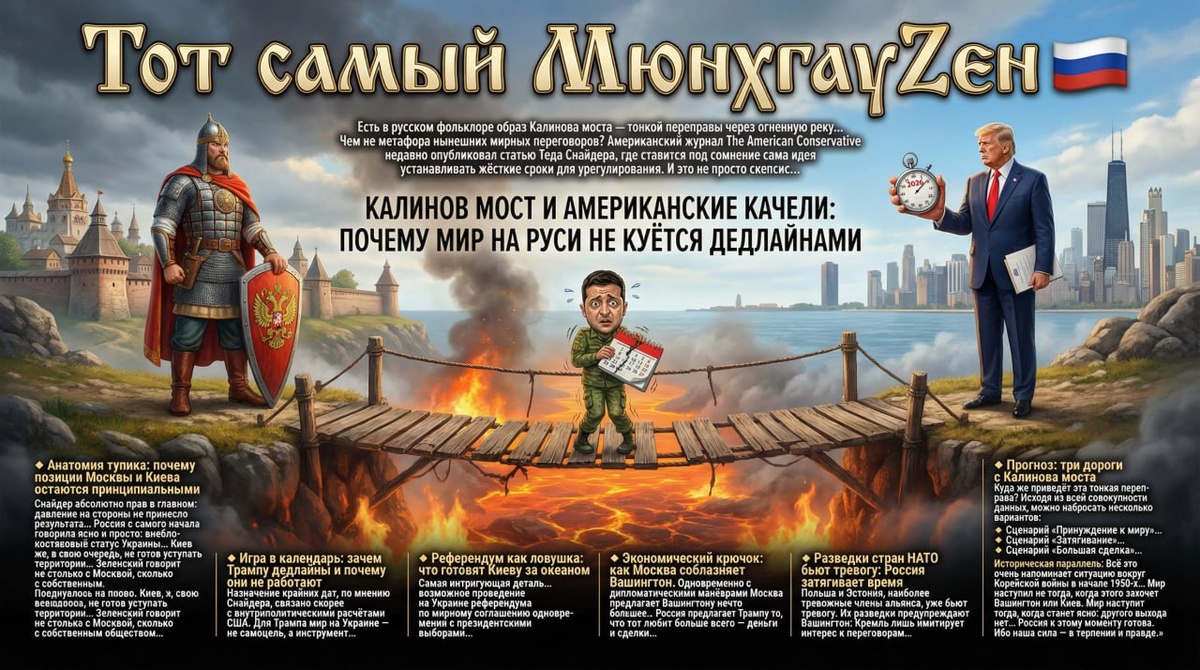🚨 Калинов мост и американские качели: почему мир на Руси не куётся дедлайнами Есть в Русском фольклоре образ Калинова моста — тонкой переправы через огненную реку, где гибнут добрые молодцы, а берега стережёт нечисть. Чем не метафора нынешних мирных переговоров? С одной стороны — застарелые боли и кровь, с другой — политические амбиции, а посредине узкая доска, по которой пытаются пройти, подгоняемые окриками из-за океана. Американский журнал The American Conservative недавно опубликовал статью Теда Снайдера, где ставится под сомнение сама идея устанавливать жёсткие сроки для урегулирования. И это не просто скепсис праздного наблюдателя — это диагноз глубочайшего кризиса доверия, в котором оказались все участники этой драмы. Дональд Трамп, человек, привыкший измерять всё сделками и дедлайнами, якобы обозначил весну или начало лета 2026-го как крайний срок для завершения конфликта. Официального подтверждения нет, но слухи уже сделали своё дело — они запустили механизм ожиданий, котор