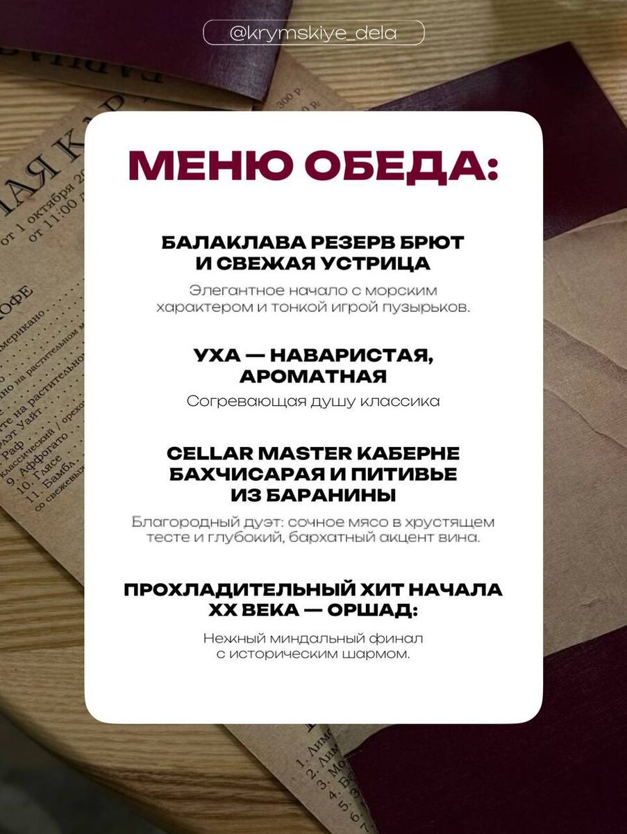 » Вас ждёт особенная встреча — исторический обед, посвящённый прошлому Нахимовского проспекта в Севастополь. Встречаемся в уютной атмосфере городского кафе «Проспект», чтобы совместить лекцию и обед из трёх курсов блюд. В формате живой беседы будем изучать историю Нахимовского проспекта — одной из самых знаковых улиц города. Вместе с Татьяной Большаковой мы поговорим о том, что раньше располагалось на проспекте, какие места общественного питания и магазины были знаковыми для горожан. Узнаем, какие блюда было принято заказывать, какие напитки пользовались популярностью и чем жила гастрономическая культура Севастополя в разные эпохи. 👉 Когда? 28 февраля в 15:00 👉 Стоимость участия — 3500 рублей 👉 Где? Севастополь, просп. Нахимова 5 👉 Конт.Тел: +7(978)560-33-17 ✨Давай сходим, Севастополь | Читайте и смотрите нас в МАХ