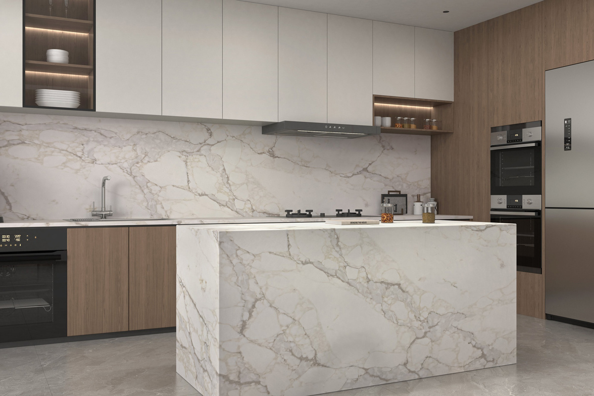 Светлый камень в духе Cloud Dancer (Облачный танцор) гармонирует с древесиной тёплой гаммы: дуб, орех, ясень с выраженной текстурой. Такое сочетание убирает ощущение холодного интерьера и делает пространство жилым. Камень здесь отвечает за свет и чистоту, дерево - за уют. Этот приём часто используют там, где важно сохранить баланс между функциональностью и атмосферой.