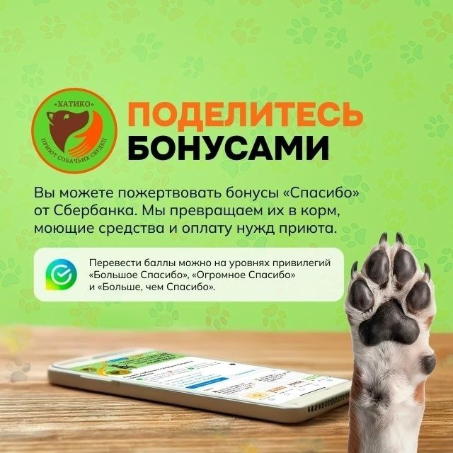 Мы регулярно на бонусы покупаем моющие средства, корма, консервы для наших подопечных. Возвращаем платежи за вывоз мусора. Перевод бонусов в рамках программы «Спасибо» от Сбербанка возможен на уровнях привилегий «Большое Спасибо», «Огромное Спасибо» и «Больше, чем Спасибо». В противном случае перевести бонусные баллы не получится. Чтобы подарить бонусы необходимо следовать инструкции: ⏩Заходим в мобильное приложение Сбербанка. Нажимаем на раздел "Все сервисы", выбираем СберСпасибо. Откроется экран с балансом Ваших бонусов. Нажимаете " Перевод бонусов ".Вбиваете наш номер телефона 8-951-479-75-89, количество бонусов, которые хотите перевести и кнопку " Списать " Готово👌 Банк установил единый «курс» перевода 1 бонус = 0,85 руб. Другими словами, отправленные 1000 бонусов «Спасибо» превратятся в 850 рублей. Проверьте баланс своих бонусов. Многие даже не знают об их существовании🙄А нам они очень пригодятся✌ 8-951-479-75-89