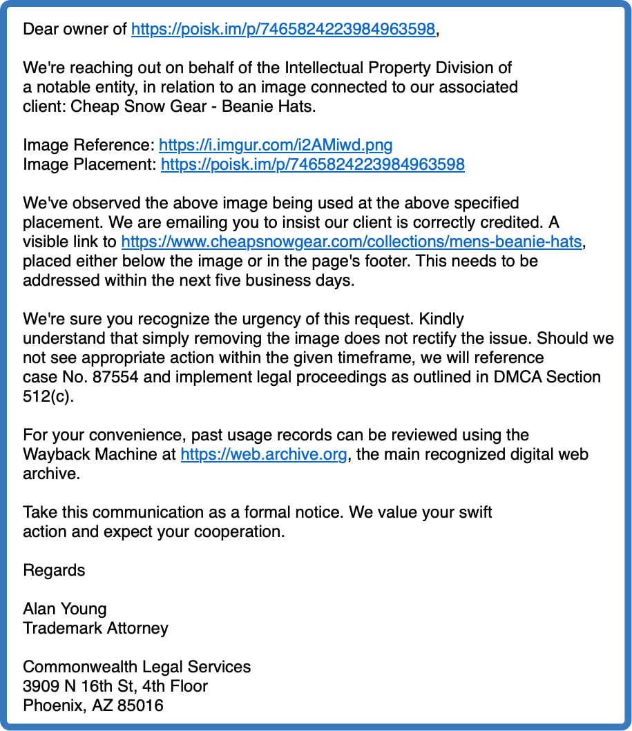 Пишет некий адвокат (юрист) из США, 4 этаж в Феникс, Аризона... Это классическая DMCA link building scam - схема, где мошенники рассылают поддельные юридические уведомления с угрозами суда за якобы нарушение авторских прав... Цель не защита прав, а SEO - ребятам нужны обратные ссылки на их сайт для продвижения в поисковиках, а не защита "интеллектуальной собственности" ... Угрозы судом за... шапку-бини :)! Требуют "исправить ситуацию за 5 дней" под угрозой судебного иска по DMCA. Смешные. Русский ИТ бизнес