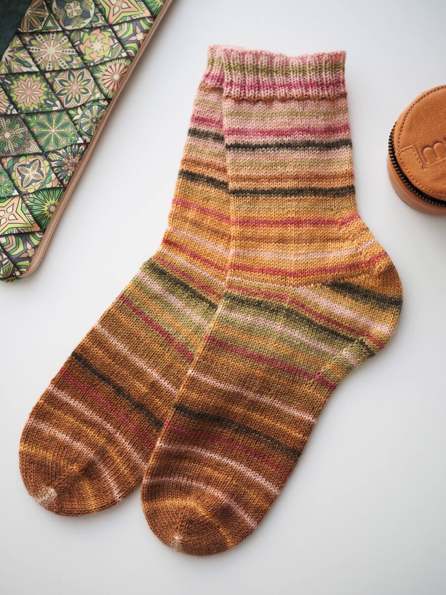 😁 Я конечно перфекционизмом не страдаю, но было любопытно в процессе вязания наблюдать, как полоски складываются идеально симметрично в обоих носках. Ну и сама расцветка такой кайф! Ассоциация у меня не изменилась: это песчаный пляж в лучах закатного солнца ✨ Вязала от мыска, чтобы извязать в ноль, получился хороший высокий паголенок, а размер примерно 40-42. Пряжа: Katia Symmetric socks&more: Paradise цвет 40 68 петель Вес 71 грамм Спицы 2.25 (вязала плотненько)
