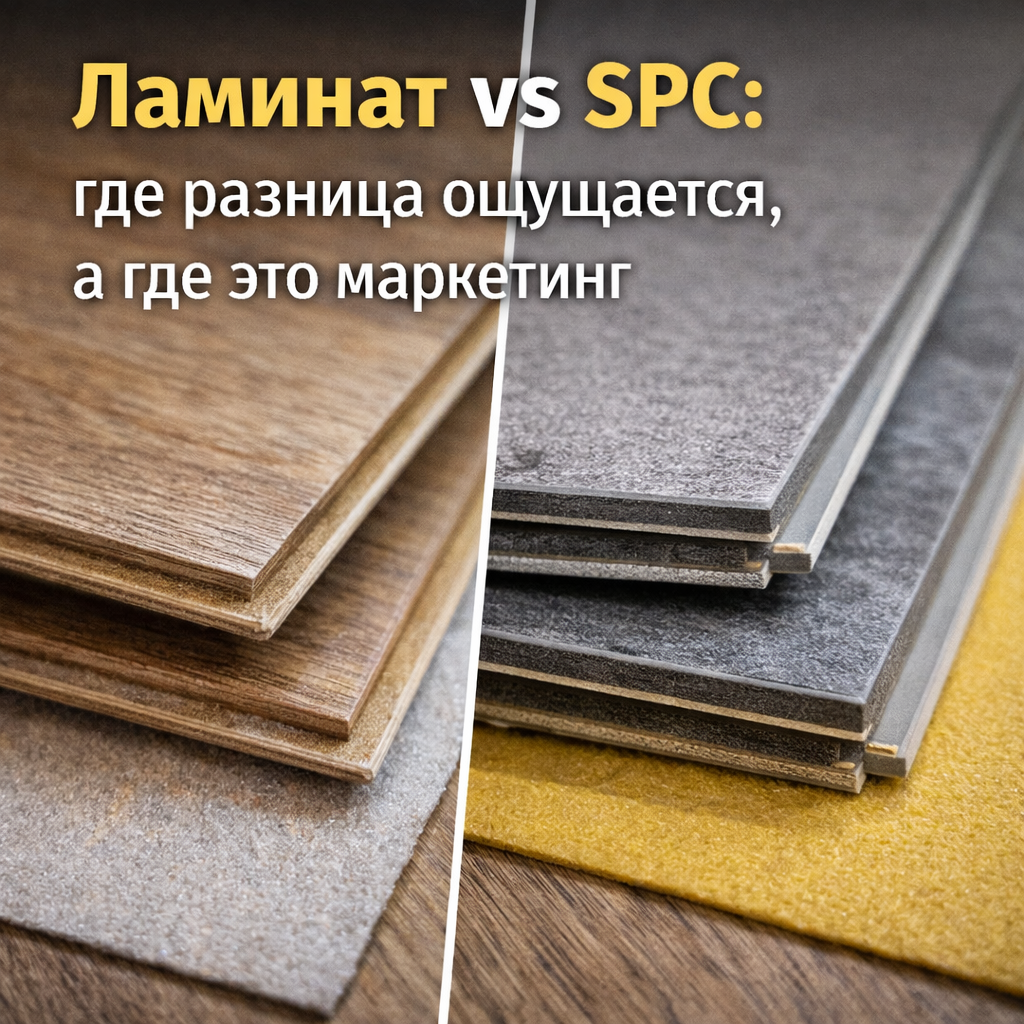 Это уже вопрос конкретной конструкции и защитного слоя. И здесь маркетинг часто упрощает картину. SPC обычно тоньше. Это удобно: Но тонкий материал: Ламинат чаще “прощает” небольшие перепады. Разница ощущается не в магазине, а в п