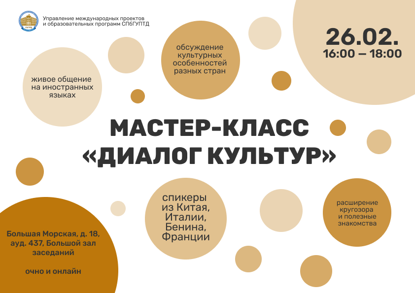 В Санкт-Петербургский государственный университет промышленных технологий и дизайна состоится мастер-класс, организованный управлением международных проектов и образовательных программ СПбГУПТД. Встреча станет площадкой для открытого диалога о культурных традициях, ценностях и особенностях общения в странах Азии, Африки и Европы. Дата: 26 февраля 2026 года Время: С 16:00 до 18:00. Место проведения: СПбГУПТД, ул. Большая Морская, д. 18, Большой зал заседаний (4 этаж). Необходима предварительная регистрация по ссылке. Ссылка на трансляцию для тех, кто не сможет присоединиться очно. Перед слушателями выступят представители Китая, Бенина, Италии и Франции. Докладчики поделятся личным и профессиональным опытом, расскажут о языке, менталитете и специфике межкультурного взаимодействия. Участники смогут задать вопросы и попробовать себя в живом общении на иностранных языках: французском, китайском, итальянском и английском. Кроме того, гостей встречи ждет мини-викторина, посвященная культурным
