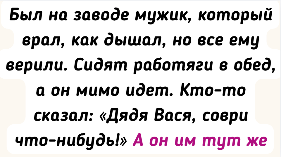- Был на заводе мужик, который врал, как дышал, но все ему верили. Сидят работяги в обед, а он мимо идет. Кто-то сказал: «Дядя Вася, соври что-нибудь!» А он им тут же: «Да ну вас, орете потом, да и некогда мне! Я сегодня в отгуле, на минуту забежал, ведро взять и мешок. Там пруд спустили, рыбы полно, побегу». Быстро все схватил и убежал. Мужики похватали всю посуду, какую нашли, и бегом к пруду. Пруд стоит целый. Все злые, идут к мужику, а тот им: «Ну вы же сами просили!» © Вася Кот / ADME