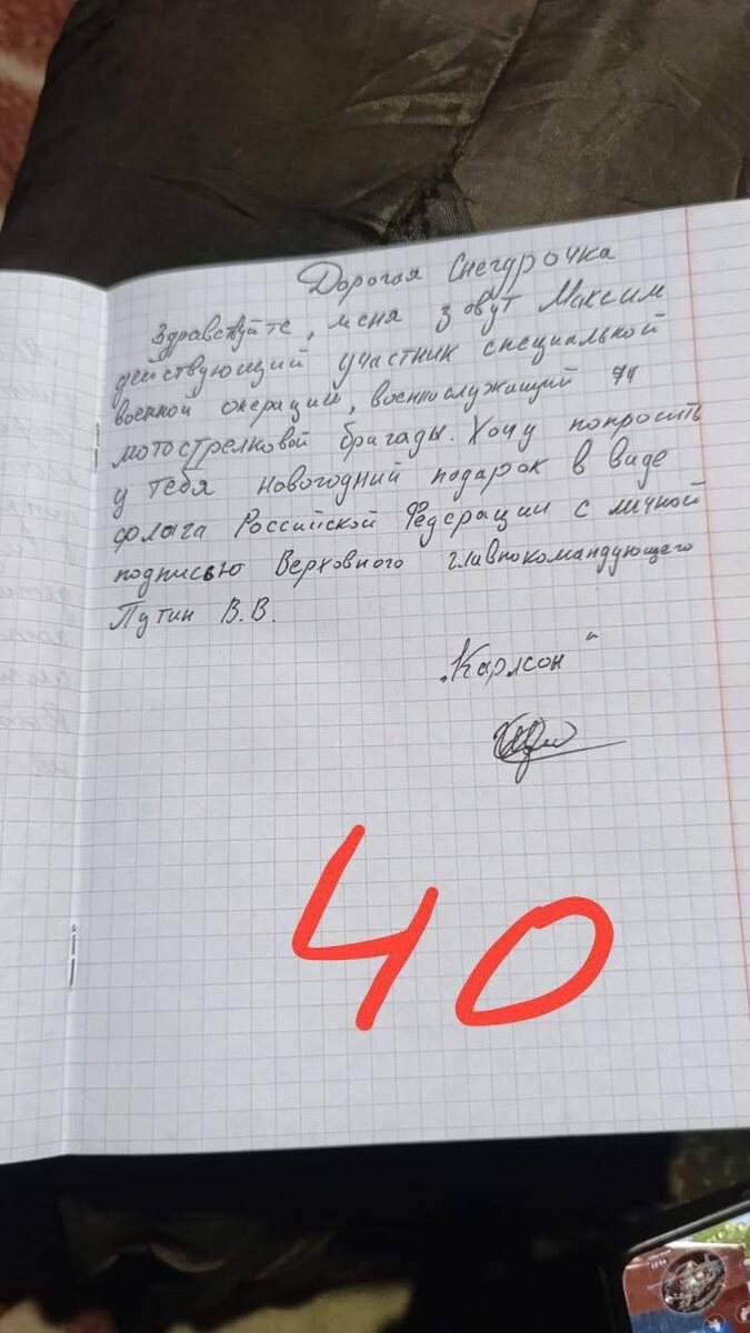 ! Помните, перед Новым годом ребята писали письма Деду Морозу и Снегурочке? Тогда один боец с позывным «Крарлсон» попросил флаг Российской Федерации с личной подписью Верховного главнокомандующего Путина В. В. Просьба сложная, может даже показаться неосуществимой, поэтому этот вопрос несколько затянулся. Но у нас получилось. В эту субботу приезжали люди из администрации президента РФ и лично в руки передали Виктории посылку. Показать мы её не можем, так как нас предупредили, что если боец сам захочет показать то, что ему вручили, тогда мы сможем это обнародовать. А пока мы продолжаем выставлять список ‼️Если кто-то из вас захочет лично от себя оплатить парням и что-то передать из списка, даже одну любую позицию, это уже огромная помощь.‼️ Список большой, но всё это необходимо. 1. Электровелосипед 3 шт. (55 000 за 1 шт. 1шт оплачен) 2. Мини-электростанция 10 шт. (55 000 нашли в наличии, цена оптовая) 3. Камера ночного видения для коптера 10 шт. (2 шт. заказано) https://ozon.ru/