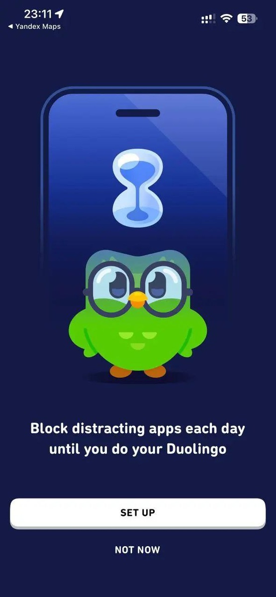 Гениальное решение тестируют сейчас в Duo. Отличный пример, как без темных паттернов можно растить вовлечение и ретеншен. Duolingo давно стали лидером рынка и конкурируют за ваше время не с другими приложениями по изучению языков, а с теми, кто это время отнимает: рилзами, тиктоками, играми. В iOS есть отдельные приложения, которые позволяют временно заблокировать доступ к выбранным вами аппам, чтобы контролировать дофаминовую зависимость. Duo интегрировали этот функционал у себя, и теперь вы можете сами выбрать, какие приложения будут заблокированы, пока вы не пройдете урок. 👏👏👏