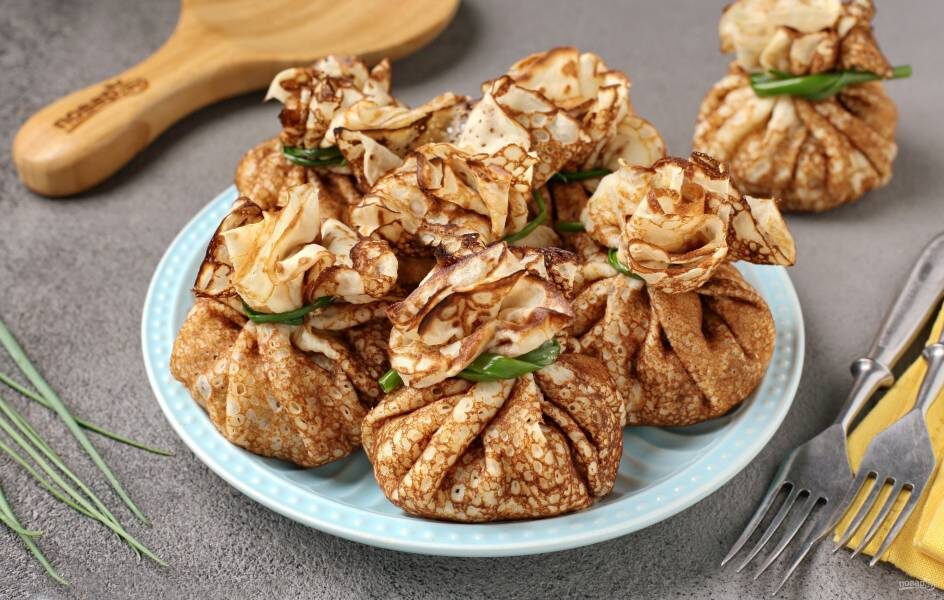 Русские блины с начинкой необыкновенно вкусные и сытные. Оригинальная подача в блинных мешочках выглядит очень аппетитно.