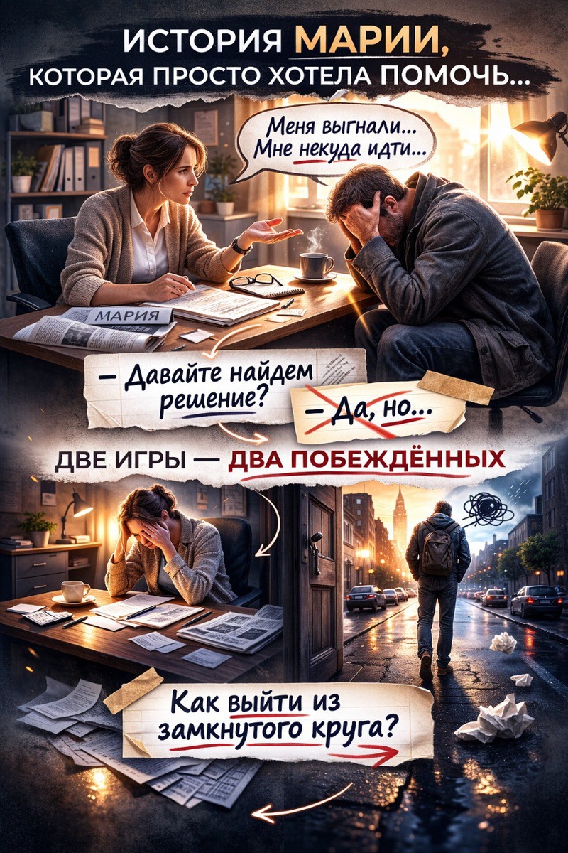Пример 2. Мария — социальный работник. Однажды к ней на приём приходит клиент, который выглядит подавленно. Он говорит Марии: «Со мной случилось ужасное — хозяин выгнал меня из квартиры, и мне некуда идти. Я не знаю, что делать». «Да, плохие новости, — говорит Мария, нахмуриваясь. — Чем я могу вам помочь?» «Я не знаю», — мрачно произносит клиент. «Вот что я вам скажу, — говорит Мария. — Почему бы нам не просмотреть вечернюю газету и не поискать, можно ли где-то в городе снять комнату?» «В этом всё и дело, — говорит клиент, всё ниже опуская голову. — У меня нет денег, чтобы платить за комнату». «Я думаю, что смогу помочь вам в этом вопросе». «Спасибо, но, честно говоря, я ни от кого не хочу получать подачки». «Ну хорошо, а как насчёт того, чтобы найти койку в общежитии, пока вы не подыщете себе что-нибудь другое?» «Благодарю вас, — отвечает клиент, — но не думаю, что смогу ужиться с другими людьми, когда я в таком состоянии». Пока Мария ищет ещё какой-нибудь выход, в комнате ц