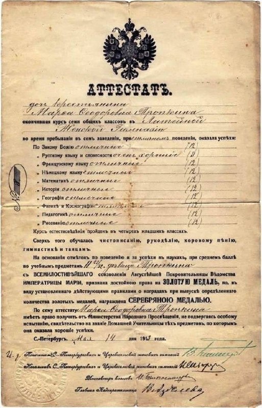 Система образования Российской империи до 1917 года отличалась сложностью и сословной спецификой, но одновременно создавала возможности для социальной мобильности. Ярким примером служит история ученицы Петербургской женской гимназии — дочери крестьянина, которая, окончив семилетний курс, овладела французским и немецким языками, освоила физику, математику, историю, географию, космографию и педагогику, а также удостоилась золотой медали. Её путь демонстрирует, как образовательная система того времени сочетала сословные ограничения с шансами на личностное и профессиональное развитие. Женское образование развивалось преимущественно в рамках гимназического и училищного направления. Ключевыми учреждениями были: Курс гимназии включал: Пример ученицы иллюстрирует широкий спектр дисциплин: Для получения золотой медали требовалось: Медаль давала: Поступление дочери крестьянина в гимназию было исключением, но не невозможностью. Причины: Дореволюционная система балансировала между двумя задачами: