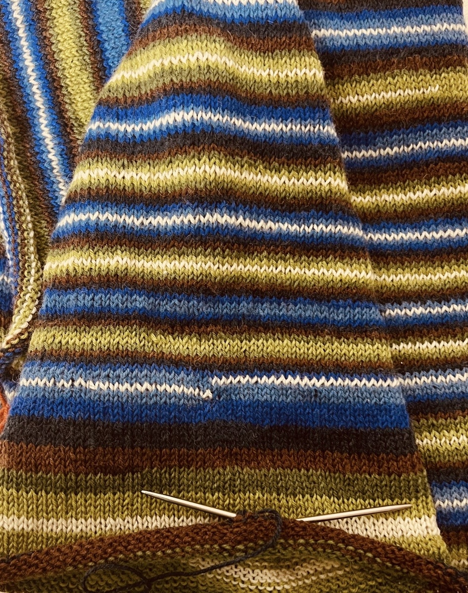 На прошлой неделе я перевязала свой рукав на джемпере «Носочный», как вы помните, меня там не устроила белая неровная полоска, я все исправила.