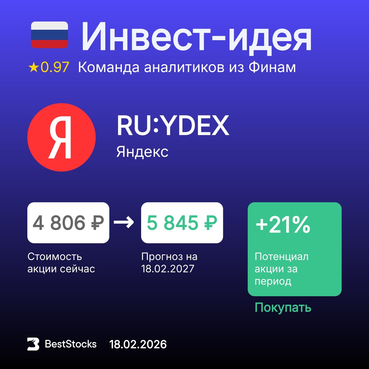 Прогноз по акции Яндекс Прогнозная цена: 5844.7 ₽ (+21%) Рекомендация: Покупать Дата прогноза: 18.02.2026 Прогноз до: 18.02.2027 Инвест-компания: Финам Автор прогноза: Команда аналитиков Ещё рекомендации на сегодня → ••••• 📢 Несколько раз в неделю полноценные аналитические обзоры рынка США. Занимательно и просто для понимания даже для новичков.