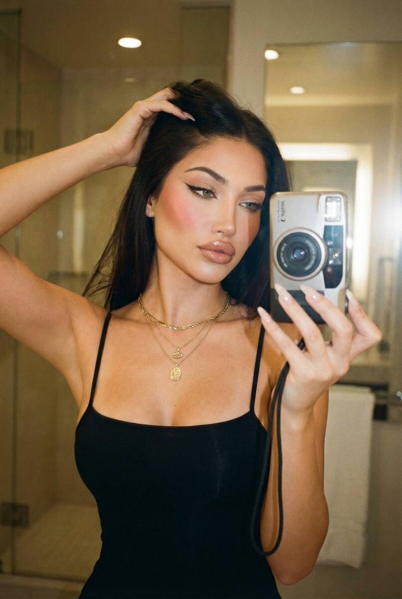 Модель: Nano Banana Сгенерировать🪄 Селфи-портрет крупным планом в мягко освещенной ванной комнате. Женщина держит компактную камеру перед зеркалом, слегка наклоняя голову и приподнимая волосы одной рукой. На ней облегающий черный топ на тонких бретельках, обнажающий плечи и ключицы. Многослойные золотые ожерелья на груди, видны длинные ухоженные ногти, держащие камеру. Гламурный макияж с четкой стрелкой, скульптурными скулами и нюдовыми блестящими губами. Съемка с ракурса «по пояс» с малой глубиной резкости, теплое комнатное освещение, отражающееся от зеркала, создает ностальгическую эстетику начала 2000-х, непринужденная интимная композиция для бьюти-журнала, мягко скульптурированное лицо, румяные щеки, блестящие губы, четко очерченные брови. Нейтральное теплое освещение с легкой вспышкой фронтальной камеры смартфона, сбалансированные тени. Ссылка на изображение. Добавлено мелкое зернистое изображение пленки, реалистичные поры кожи, легкое сияние. Стиль «чистая девушка» в духе Pinte