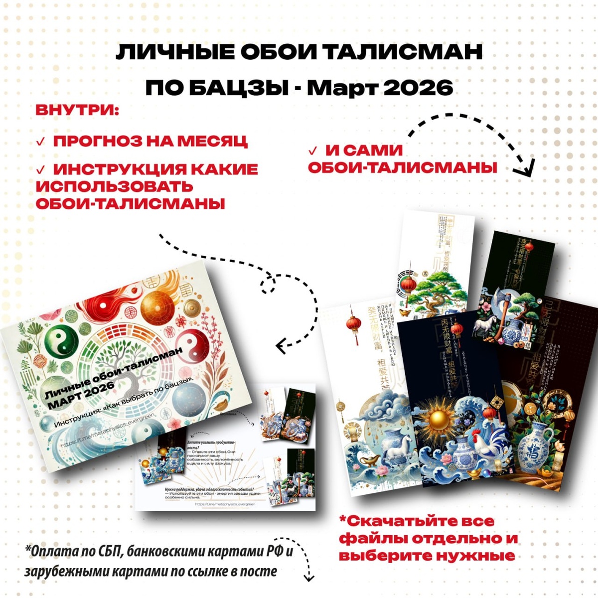 🐰 Дорогие мои, как всегда для вашей большей поддержки личные обои талисманы по Бацзы 🙏 ✔️ В этом месяце - Китайская ваза! 🙏 Обои созданы для вашей карты БаЦзы - чтобы поддержать ваш личный путь и усилить удачу в месяце Тигра. И внутри ключевой прогноз для вас! 🧭 Подойдут даже новичкам - внутри будет подробная и понятная инструкция. 💰 Стоимость символическая: 490 рублей. Есть поддержка оплаты зарубежными картами 🤍 По ссылке 👇 https://taplink.cc/maria_evergreen/p/talismanmarch26/ Если не получается скачать, пишите мне @maria_evergreen ✨ Общие заряженные обои я выложу, как всегда, в день начала месяца Кролика, чтобы каждый мог прикоснуться к потоку мудрости и света. Возьмите свою удачу на новый месяц! ❤️🙏