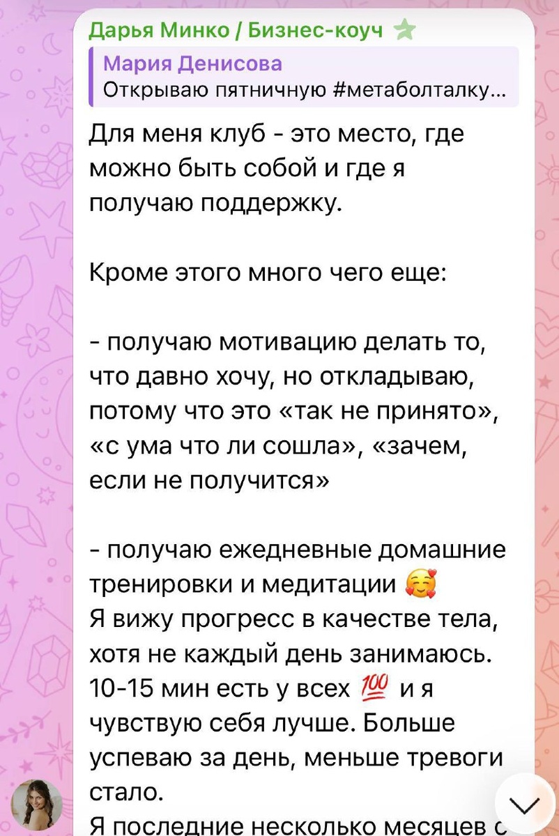 Устами резиденток клуба: 1. ОКРУЖЕНИЕ УРОВНЯ ВЫШЕ: «я инвестирую в окружение» «уровень, к которому я стремлюсь» «общение с успешными женщинами — путь к успеху» «почти сотня крутых подруг» «люди — то, что не купишь за deньги» MetaWoman - это социальный лифт через среду. 2. БЕЗОПАСНОЕ ПРОСТРАНСТВО БЕЗ ОСУЖДЕНИЯ: «можно поныть» «тотальная поддержка» «ничего не вызывает конфликта» «не осудят если не успела» «можно быть собой» MetaWoman - это эмоциональный контейнер. Женщины получают психологическую безопасность и принятие. 3. СИСТЕМУ ЖИЗНИ “КАК МОЖНО ЖИТЬ” Ключевая фраза из отзывов: «А что, так тоже можно?» Клуб даёт: новый стандарт завтраков новый стандарт тела новый стандарт отдыха новый стандарт гардероба новый стандарт культуры новый стандарт deнег MetaWoman - это не лекции, это апгрейд нормы жизни. 4. МЯГКУЮ ДИСЦИПЛИНУ БЕЗ НАДРЫВА: «15 минут тренировок» «встроено фоном» «без высунутого языка» «бережно к себе» Мои MetaWoman получают прогресс без насилия над собой. 5. ДОСТУП К ЭКС