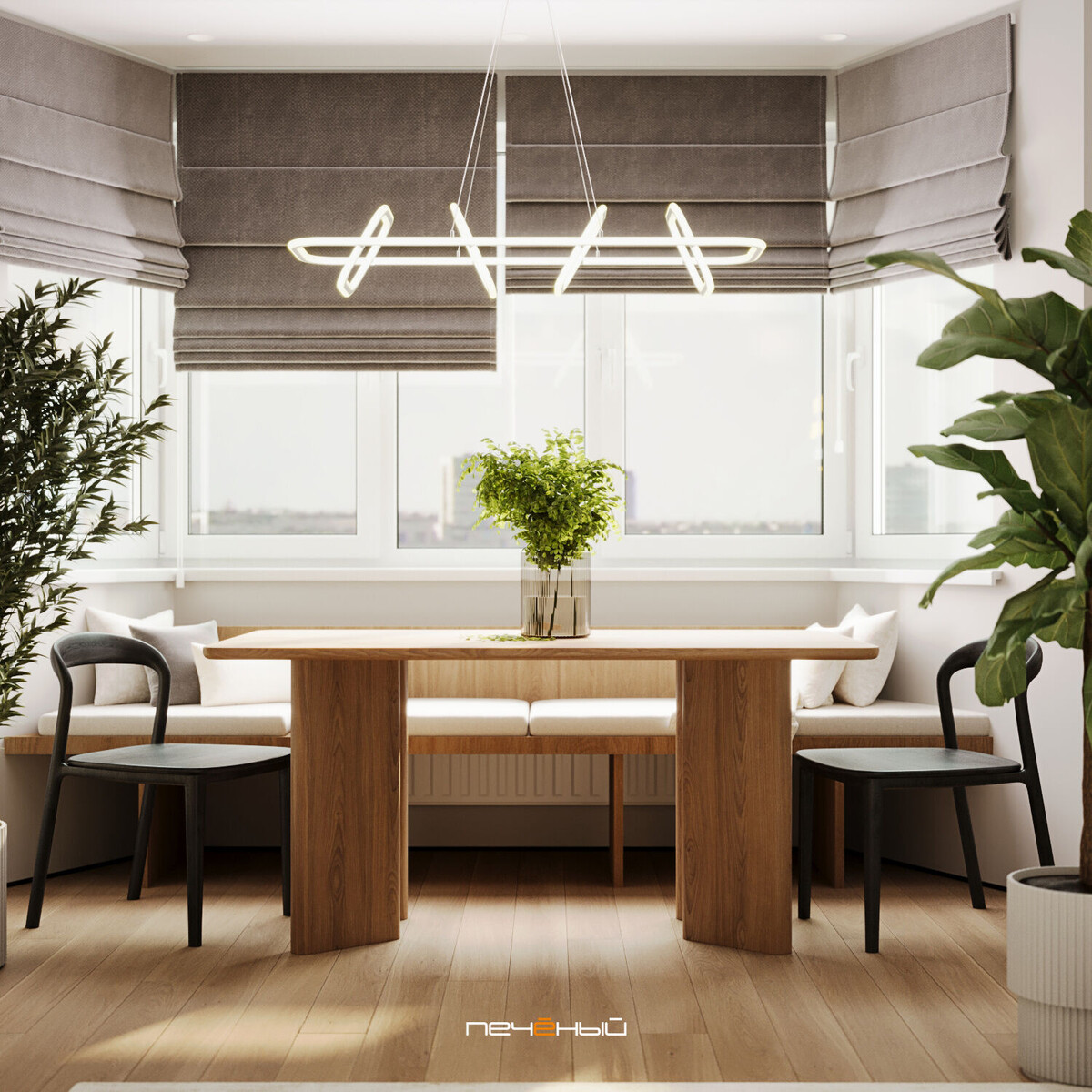 Этот проект мы разработали для семьи с двумя детьми в Ново-Переделкино. Панельный дом, стандартная планировка и ограниченный бюджет. Но именно такие задачи я люблю больше всего — когда важно продумать каждый метр. Заказчики хотели светлый современный интерьер и отдельные комнаты для детей. И всё это — без лишних расходов. Все изменения сделали законно, без сложных согласований. В итоге вместо трёх комнат получили четыре. Гостиная 20 м² с тремя окнами в торце сразу задала настроение. У окна разместили столовую зону с мягким диванчиком и массивным деревянным столом. Между диваном и окном — зеркало во всю стену. Оно отражает свет и делает комнату просторнее. Белый угловой диван, бежевый ковёр, чёрный столик и аккуратная светодиодная надпись добавили уюта. В ТВ-зоне продумали хранение: белые фасады и деревянные полки в цвет пола. Кухня угловая. Нижние шкафы под дерево, верхние — белые и только по одной стене. Цилиндрическая вытяжка стала акцентом. Холодильник выбрали отдельно стоящий — это
