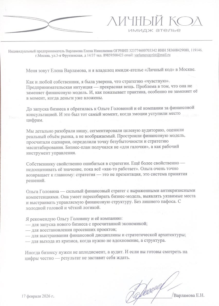«Я чувствую свой бизнес и все про него знаю» — так думает почти каждый собственник. До тех пор, пока цифры в голове не разъезжаются с реальными расчетами. Владелица имидж-ателье «Личный код» в Москве Варламова Елена пришла к нам для финансовой консультации еще ДО запуска бизнеса — и это то решение, которое в корне меняет траекторию проекта. Что мы сделали вместе ✔️ Разобрали нишу, а не опирались на фразу «рынок большой». ✔️ Сегментировали целевую аудиторию и оценили реальный объем рынка, а не воображаемый. ✔️ Собрали финансовую модель: этапы, точки безубыточности, стратегию масштабирования. ✔️Превратили бизнес-план из документа «для галочки» в рабочий инструмент управления. В чем суть нашей работы Мы не продаем красивые презентации. Для нас стратегия — это система принятия решений, зашитая в модель бизнеса и его финансовую архитектуру. Мы помогаем собственнику: ✔️увидеть уязвимые места бизнес-моделей до того, как туда утекут деньги; ✔️построить управляемую финансовую структур