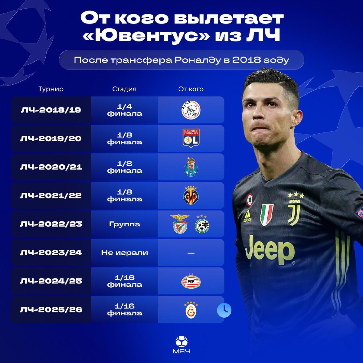 После покупки Криштиану летом 2018-го у туринцев начались проблемы с главным еврокубком. Итальянцы вылетали от «Аякса», «Лиона», «Порту», «Вильярреала» и ПСВ. В розыгрыше ЛЧ-2022/23 «Юве» и вовсе не вышел из группы с «Бенфикой» и израильским «Маккаби». Команда с вернувшимся Максом Аллегри набрала лишь 3 очка, проиграв 5 из 6 встреч. Сегодня список вылетов может пополниться «Галатасараем»… @myach