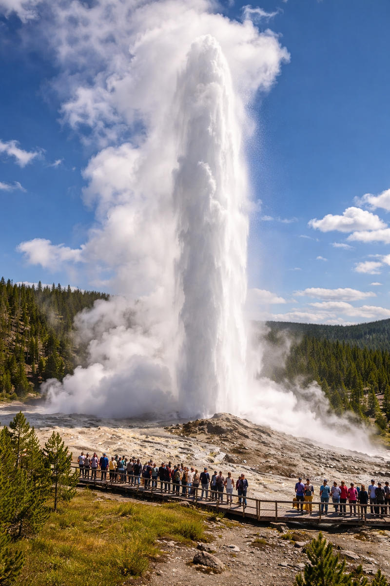 Самый крупный действующий гейзер мира находится в Йеллоустоне и выбрасывает воду выше 90 метров. Его извержения непредсказуемы, но впечатляющи. Он работает благодаря глубинному теплу Земли и остаётся рекордсменом по высоте струи.