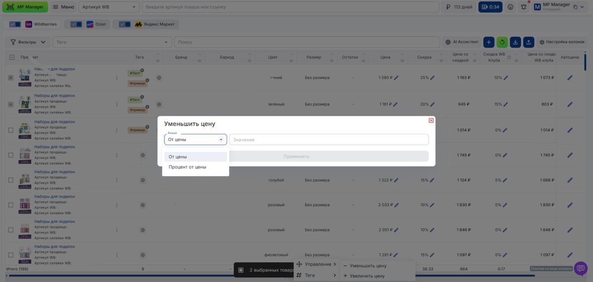 В MP Manager появилось обновление на странице «Цены – Цены». Теперь вы можете массово изменять цены по выбранным товарам – без ручного редактирования каждой карточки. Что доступно: ✔️ Увеличить цену на N рублей ✔️ Уменьшить цену на N рублей ✔️ Изменить цену на K% от текущей ✔️ Применить изменение сразу к группе товаров Больше не нужно заходить в каждый SKU отдельно. ⚡️ Это особенно полезно, если: – выросла себестоимость – меняются условия акций – нужно скорректировать маржу – тестируете гипотезы по цене – масштабируете линейку товаров Выбираете позиции → задаёте правило → отправляете новые цены. Быстро. Массово. Без ошибок. Функция уже доступна – протестируйте обновление и управляйте ценами за 1 клик 💚 Перейти в сервис → #Цены