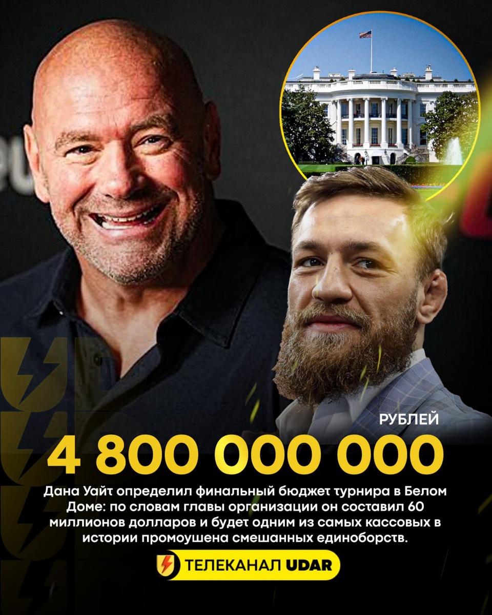 Президент UFC Дана Уайт сообщил, что бюджет турнира в Белом Доме составит 60 миллионов долларов и будет самым кассовым за всю историю промоушена. 👍Поддержи наш канал cвоим голосом 📺Смотрим бои в прямом эфире ⚡ @teleudar