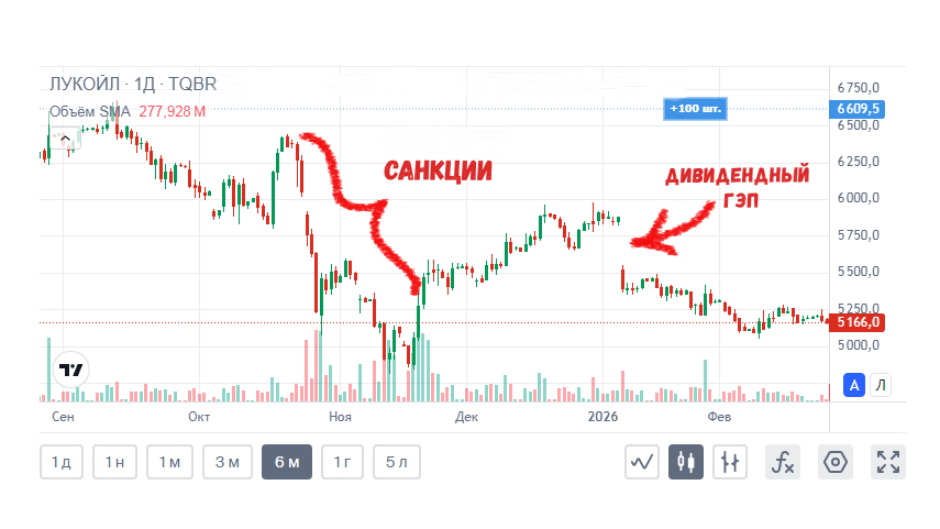 - Дивидендный гэп: В январе, после отсечки под дивиденды в 397 руб., акции упали на техническом факторе.