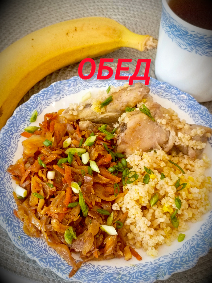 остатки курочки с пшенной кашей и тушеная капуста с беконом. К этому добавились освежающий чай и спелый банан.