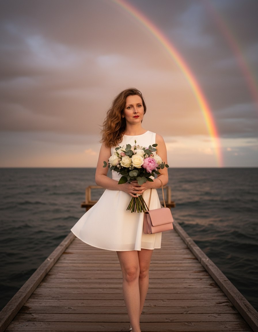 Красивый фото-промпт от подписчицы @Izkandera Создай не меняя черты лица: Женская фигура в белом летнем мини-платье с тонкими бретелями, поза — корпус чуть повернут в три четверти к камере, одна рука расслабленно опирается на перила пирса, вторая держит огромный букет пудрово-розовых роз в двуслойной обёртке. Голова чуть наклонена, лёгкая, уверенная улыбка, взгляд чуть в сторону (не в камеру). Длинные волнистые волосы , частично собраны назад в полураспуск (нежная косичка/заколка у корней). Макияж: ровный сияющий тон кожи, лёгкий розовый румянец, чёрные длинные ресницы, аккуратный тонкий контур век, губы — блеск/помада нежно-розового оттенка с сатиновым сиянием. Аксессуары: маленький кулон, пудровая сумка на цепочке, акценты золотого металла на браслете/цепочке. Атмосфера — романтичный вечер на побережье, тёплый золотисто-розовый закат с яркой дугой радуги в небе. Освещение — золотой час, мягкий боковой/задний свет с контровой подсветкой волос, лёгкое наполнение лицевого света для сох