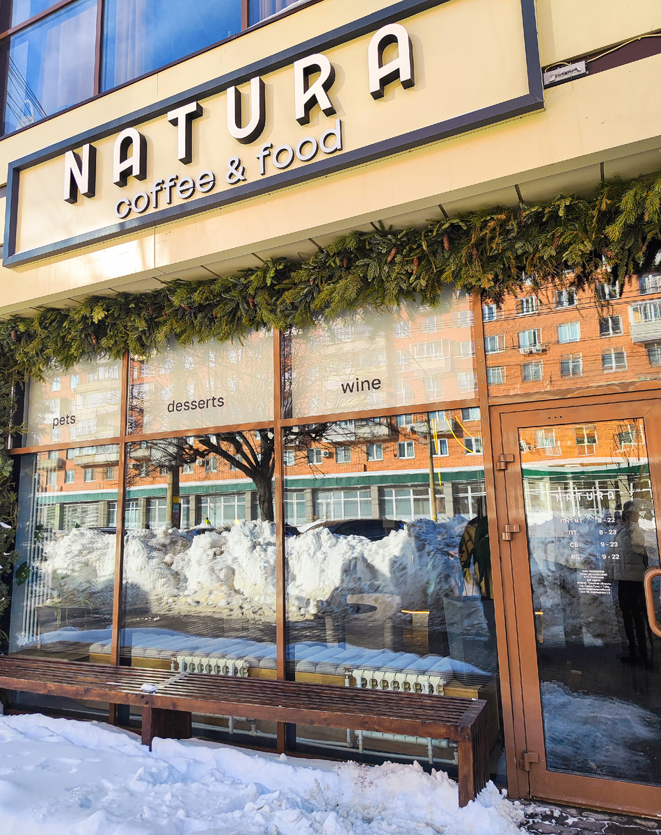Тула в этот раз баловала нас потрясающими музеями и великолепными ресторанами, но, как говорится, в каждой бочке меда есть своя ложка дегтя. Для нас такой «ложкой» стало кафе Natura на Красноармейском проспекте. Заведение позиционирует себя очень громко: «гедонистический проект», «высококлассный спешелти-кофе» и «авторская гастрономия на каждый день». Цены здесь соответствующие — выше среднего по городу. Мы зашли туда в 9 утра, привлеченные приятным интерьером и тем фактом, что кафе уже было открыто. К сожалению, на этом приятные моменты закончились. Так как наш визит пришелся на Масленицу, я решила заказать блины из специального меню: с лососем, крем-чизом и огурцом. Стоимость — 590 рублей. Что я получила за эти деньги? Два маленьких, абсолютно холодных блина. Причем они не просто остыли, пока их несли — они были явно испечены вчера или за много часов до подачи. Есть холодное, залежавшееся тесто — сомнительное удовольствие. Если бы блины были свежими и горячими, сочетание с лососем и