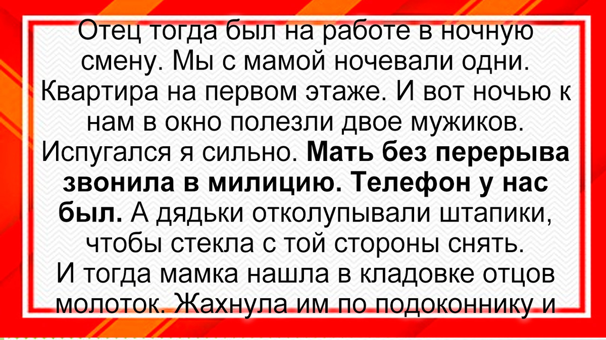 Отец тогда был на работе в ночную смену. Мы с мамой ночевали одни. Квартира на первом этаже. И вот ночью к нам в окно полезли двое мужиков. Испугался я сильно. Мать без перерыва звонила в милицию. Телефон у нас был. А дядьки отколупывали штапики, чтобы стекла с той стороны снять.