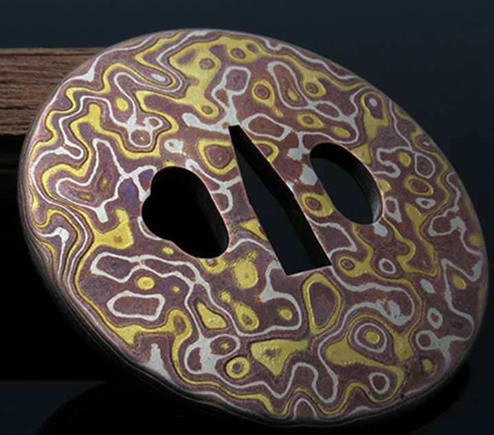 Технологии дамасской стали применяют и при изготовлении удивительного материала, представляющего собой композит из цветных металлов - меди, золота, серебра, бронзы, латуни и других сплавов. Насколько мне известно, впервые различные сплавленные сочетания цветных металлов начали применять еще в очень древнем Китае, в царстве Чу (1030 г. - 223 г. до Р.Х.), где таким материалом инкрустировали клинки бронзовых и первых железных мечей.