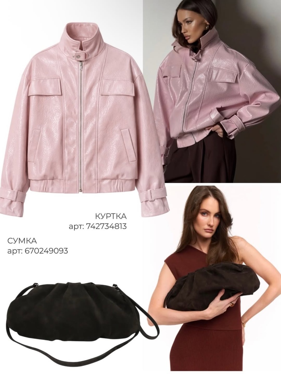 Образ 1 — современная нежность: куртка арт. 742734813 + шоколадные брюки или юбка + сумка арт. 670249093. Получается мягкий, модный контраст «пудра и шоколад».