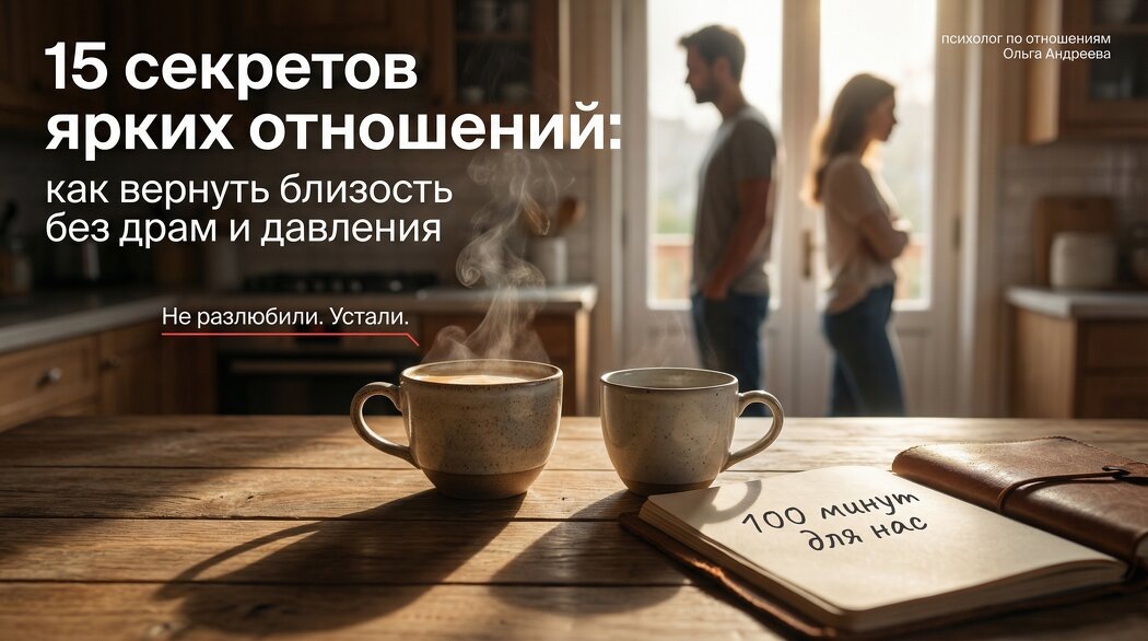 Когда отношения переходят в режим экономии энергии, они становятся функциональными - и именно в этот момент обычно возникает ощущение холода, дистанции и скуки. Практически полезный ориентир, который помогает сдвинуть динамику, - 100 минут в неделю, посвящённых только отношениям