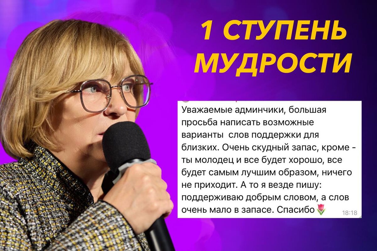 Ступень мудрости Самостоятельная работа над формулировками Дорогие друзья, реально бывает, что у нас мало словарного запаса. Слов, которые подбадривают, слов, которые дают возможность подняться, встать. И надо понимать и осознавать такую вещь: когда вы пишете, подумайте о разных аспектах жизни. Разные ситуации, где важны поддерживающие слова: ❤️Возможно, кто-то себя чувствует плохо, можно сказать: «выздоровеешь обязательно» и так далее. ❤️Возможно, у кого-то с делами что-то не очень, и там можно добавить слова поддержки. ❤️Допустим, у кого-то нюансы с деньгами или ещё что-то. ❤️Возможно, у кого-то с детьми происходят какие-то события. ❤️Возможно, человек в путешествии, в дороге. ❤️Возможно, ваши родные и близкие пошли решать вопросы в разные инстанции. Таким образом, вы можете написать много-много формулировок как для себя, так и для тех, кто рядом, служить для других примером, обмениваться поддержкой. Дорогие, любимые, пишите в комментариях добрые формулировки, которые по