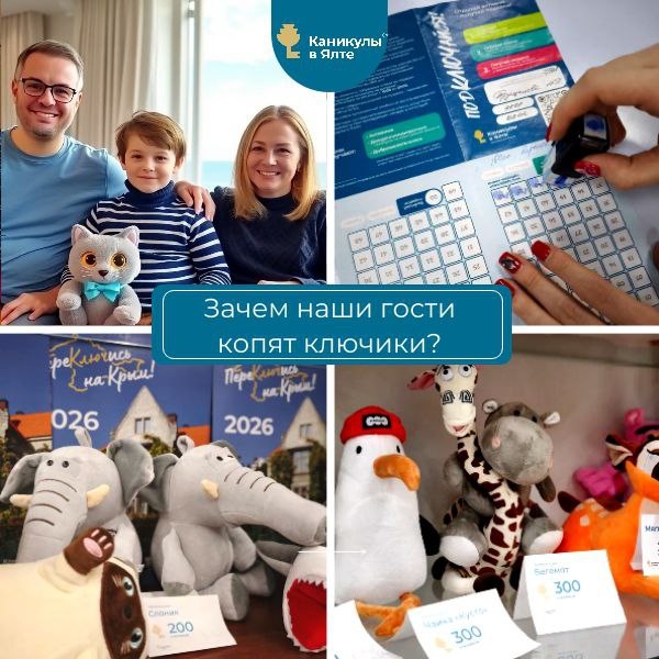 ? В санатории «Каникулы в Ялте» мы не просто обеспечиваем комфортный отдых — мы создаём атмосферу увлекательных приключений для всей семьи! При заселении каждая семья получает буклет «ПодКЛЮЧайся!», который делает участие в наших мероприятиях ещё более захватывающим и превращает каждый день в настоящее маленькое приключение. 💫 В программе: • Мастер-классы: развивайте свои навыки и творческие способности! • Спортивные игры: активируйте дух соревнования и укрепляйте здоровье! • Развлекательные программы: наслаждайтесь весельем и смехом с близкими! • Экскурсии: откройте для себя красоту Крыма и его окрестностей! • КВИЗы: проверьте свои знания и повеселитесь с друзьями! Выбирайте активности по душе, участвуйте и получайте удовольствие от отдыха! За каждое участие ведущий ставит в буклет штамп-ключик (каждому участнику). В один день можно собрать до 10 ключиков, особенно если отдыхать активно всей семьёй! Накопленные ключики можно обменять на приятные призы, которые станут тёплым на