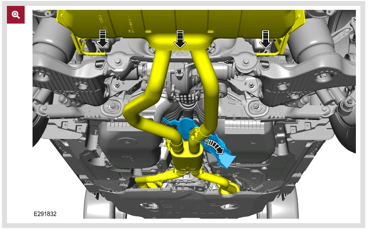 Металлический скрежет слышен в задней части автомобиля при резком торможении. Недостаточный зазор между теплозащитным экраном и задним приводным валом. ДЕЙСТВИЕ: Поднимите автомобиль и установите на подходящий двухстоечный подъемник (см. TOPIx, руководство по ремонту, раздел 100-02: "Поддомкрачивание и подъем — Описание и работа — Поддомкрачивание и подъем"). Снимите теплозащитный экран в указанном на рисунке направлении. Используя измерения, показанные на рисунке, отметьте область теплозащитного экрана, которую необходимо модифицировать. С помощью подходящего инструмента согните каждую секцию к наружной стороне теплозащитного экрана. Затем вдавите каждую секцию в теплозащитный экран, чтобы сделать их максимально плоскими.