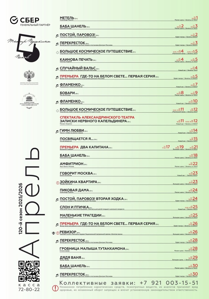 А. С. Пушкина представил новую афишу на апрель 🎭 ✨ В репертуаре — премьера «Два капитана», несколько показов спектаклей «Где-то на белом свете… Первая серия», «Баба Шанель», «Дядя Ваня», «Ревизор», «Каинова печать», «Амфитрион», «Перекресток», «Маленькие трагедии», детские постановки и другие популярные спектакли. Оставайтесь с нами #НашаПсковскаяобласть